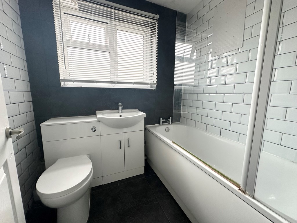 BATHROOM / WC Window to rear, heated towel rail, White suite comprising; panelled bath with shower attachment and mixer taps, wash hand basin with mixer taps and cupboards beneath, close coupled WC, tiled splashbacks.